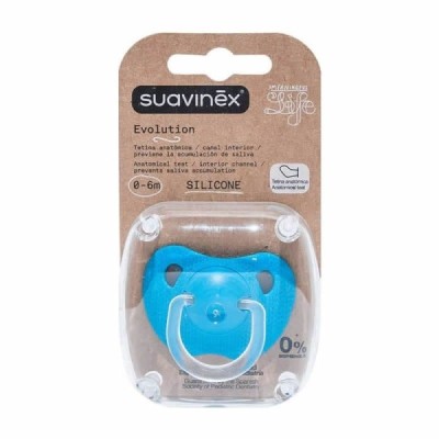 Chupete Suavinex con tetina anatómica de silicona que imita la forma del pezón materno durante la succión.