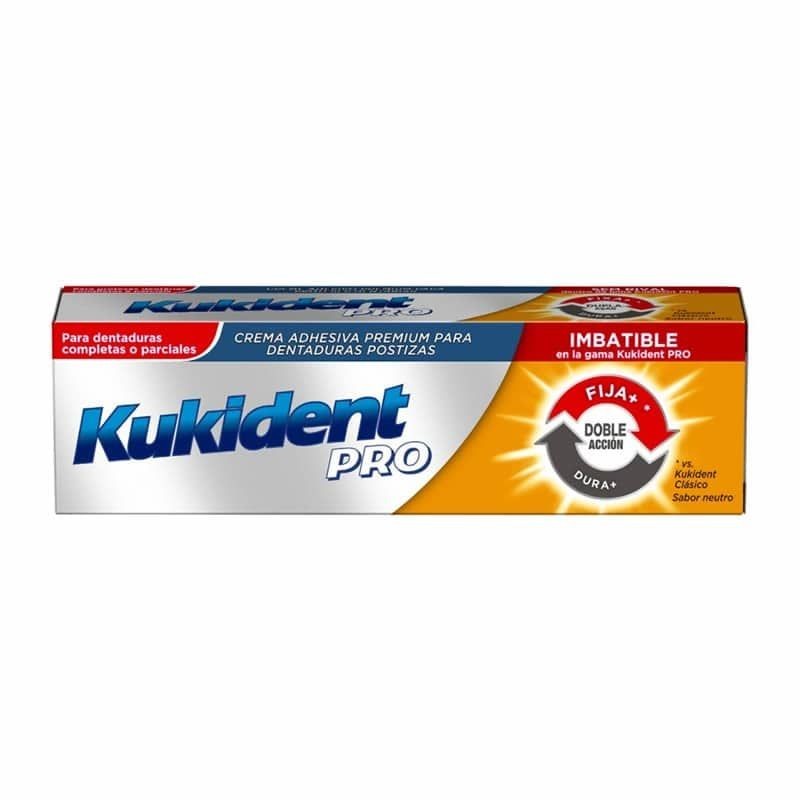 Crema adhesiva para personas que tengan que usar dentadura postiza. Usar prótesis dentales totales o parciales es la solución que usan en muchos casos las personas mayores o personas que hayan perdido piezas dentales por el motivo que sea. Para que esto no signifique dejar de disfrutar de su vida con la misma libertad que antes es necesario contar con la seguridad de que la prótesis se mantendrá fija. Para conseguir esto, lo mejor es recurrir a marcas expertas como Kukident, que en esta ocasión ha desarrollado esta crema adhesiva con doble acción: fija más y fija durante más tiempo. Con ella podrás volver a reír, comer y beber con normalidad sin preocuparte de tu prótesis. Limpia tu boca y la prótesis eficazmente antes de comenzar. Pon una cantidad suficiente de producto sin acercarte demasiado a los bordes sobre la parte de la prótesis que se pega a la boca y presiona durante unos segundos para fijarla.