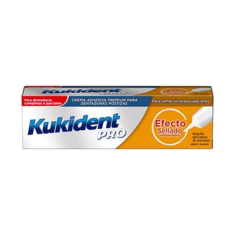 Crema adhesiva para personas que tengan que usar dentadura postiza. Cuando una persona usa prótesis dental, el principal motivo es para poder ser capaz de comer con normalidad, pero a veces no es suficiente con utilizar la prótesis. En muchos casos, cuando la persona usa la prótesis, la comida se queda adherida en el espacio que se crea entre esta y la encía, provocando daños y mal aliento. Para evitar esta situación, Kukident ha creado esta crema adhesiva efecto sellado que cuenta con una boquilla especialmente fija que permite fijar y sellar la prótesis hasta los bordes y evitar así que se introduzcan restos de comida o bacterias. Limpia tu boca y la prótesis eficazmente antes de comenzar. Pon una cantidad suficiente de producto y presiona sobre la boca durante unos segundos hasta que se quede fija.