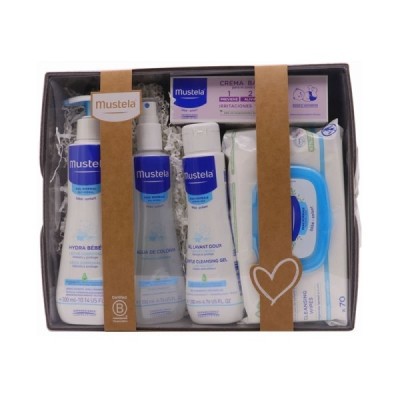 Canastilla que contiene Hydra Bebé Leche Hidratante 300ml, Agua de Colonia Sin Alcohol 200ml, Gel de Baño Suave 500ml, Crema Bálsamo 1-2-3 50ml y Toallitas Dermo-suavizantes 70 Unidades. Son los productos ideales para mantener la dermis de los bebés y niños, cuidada, hidratada y limpia. Ninguno de estos productos contiene parabenes. La crema hidratante es de uso diario y se debe aplicar por todo el cuerpo masajeando suavemente para facilitar la absorción. El gel de Mustela es también de uso diario y se aplica por todo el cuerpo masajeando hasta que haga espuma y después aclarar con agua abundante. Ninguno de los productos Mustela contiene parabenes.