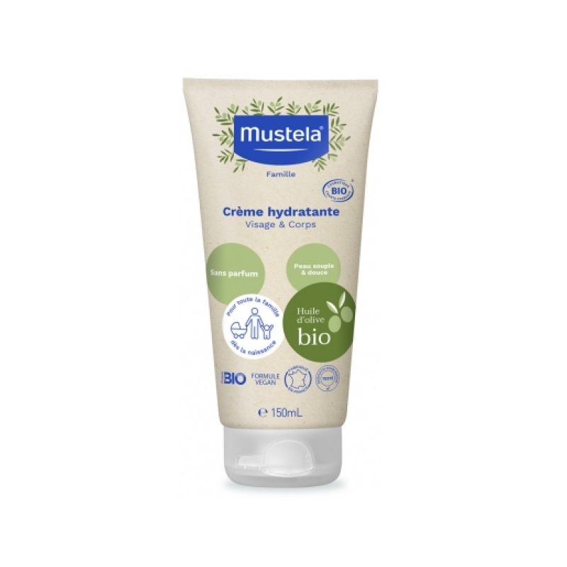 Crema hidratante BIO de la marca de cuidado del bebé Mustela, con aceite de oliva para nutrir intensamente la piel. No contiene perfume. Indicada para rostro y cuerpo. Recomendada para el cuidado de la piel de toda la familia: bebés, incluso prematuros, niños/as y adultos. El 99% del total de los ingredientes son de origen natural. Apto para veganos. Después del baño o del aseo, atempera la crema en las manos y aplica en la cara y el cuerpo, insistiendo en las zonas secas.