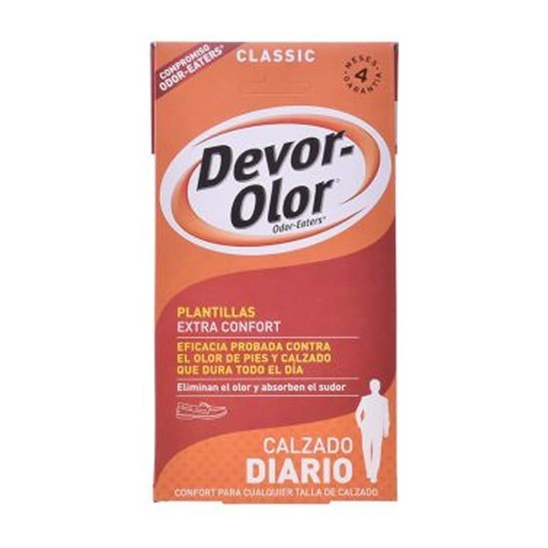 Las plantillas para el calzado diario de Devor Olor, son desodorantes diseñadas para eliminar el mal olor del calzado y de los pies al usarlo. Neutraliza los ácidos y las bacterias, previniendo la aparición de malos olores, irritaciones e infecciones. Este estilo está formulado bajo una tecnología mejorada que elimina y controla con una mayor eficacia los malos olores, absorbiendo el exceso de humedad y manteniendo los pies frescos durante todo el día con sus agentes antibacterianos y los complejos de espuma de carbón activado e insta fresh.