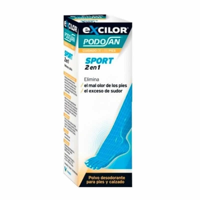 Talco desodorante anti-transpirante para pies y calzado. Reduce la sudoración excesiva del pie y elimina el mal olor. Es un tratamiento con propiedades anti olor, antisépticas y antitranspirantes. Además, posee un efecto refrescante que incrementa la sensación de bienestar del calzado. Podosan Sport se ha diseñado específicamente para aquellas personas que realizan ejercicio físico, que caminan mucho o permanecen mucho tiempo de pie. Además protege el calzado al hacerlo más cómodo y eliminar el mal olor. Aplicar en los pies, especialmente entre los dedos, antes y/o después de cualquier ejercicio físico, después de la ducha, etc. Espolvoréelo también en el interior del calzado cuantas veces crea necesario.